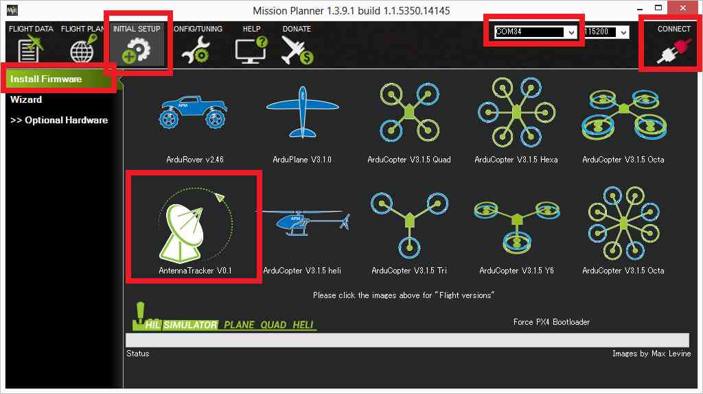 从 初始设置 | 安装固件 点击页面左下方的 "天线跟踪器 "图标。按照出现的指示操作,一分钟左右后固件就会上传,您就可以与Mission Planner地面站连接,并看到飞行数据屏幕的 HUD 更新。