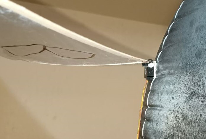 现在可以将舵机角粘在鳍上,以便与舵机连接。粘接时要注意,鳍与舵机机身之间要有足够的间隙,以便舵机能够充分活动。对于照片中的鳍和舵机,最好将舵机角粘在舵机上,这样当连接到舵机时,鳍的木头位于舵机输出齿轮更靠近边缘的一侧。