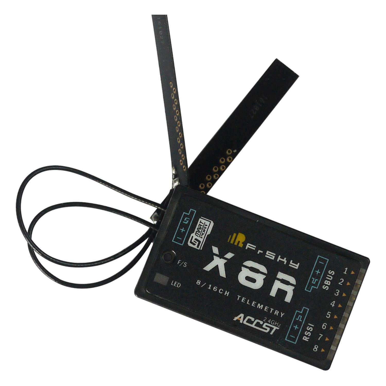 Taranis 发射机集成了 ACCST 2.4GHz 发射机,可与 X 系列 FrSky 接收机兼容,如非常流行的 X8R 或更新、更轻的 XSR 接收机。 这意味着不需要额外的 JR 型发射器模块。 如有需要,Taranis X9D Plus 和 Taranis QX7 都有 JR 模块托架,可用于外接无线电发射机。