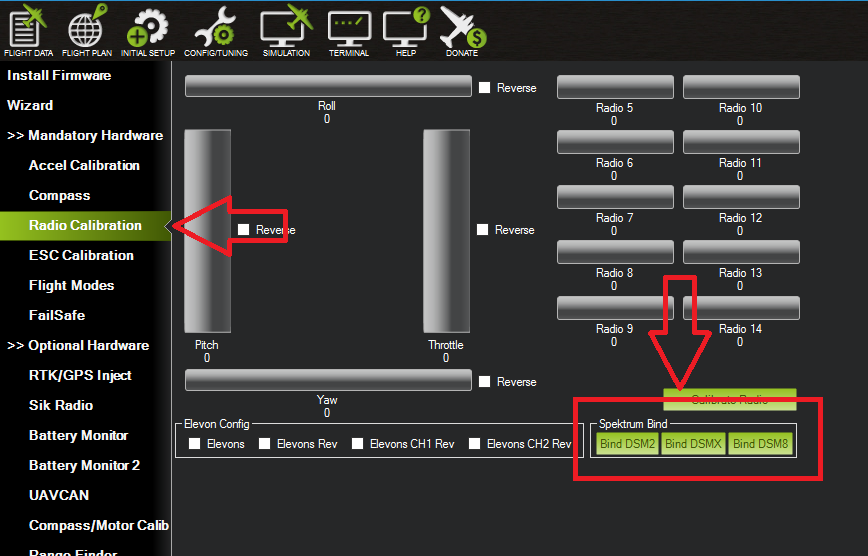 使用Mission Planner地面站绑定卫星接收机,启动绑定。该功能位于初始设置的无线电校准屏幕中。