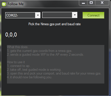 在Mission Planner地面站中输入 Control-F 打开以下窗口。点击 "目标跟随Follow me