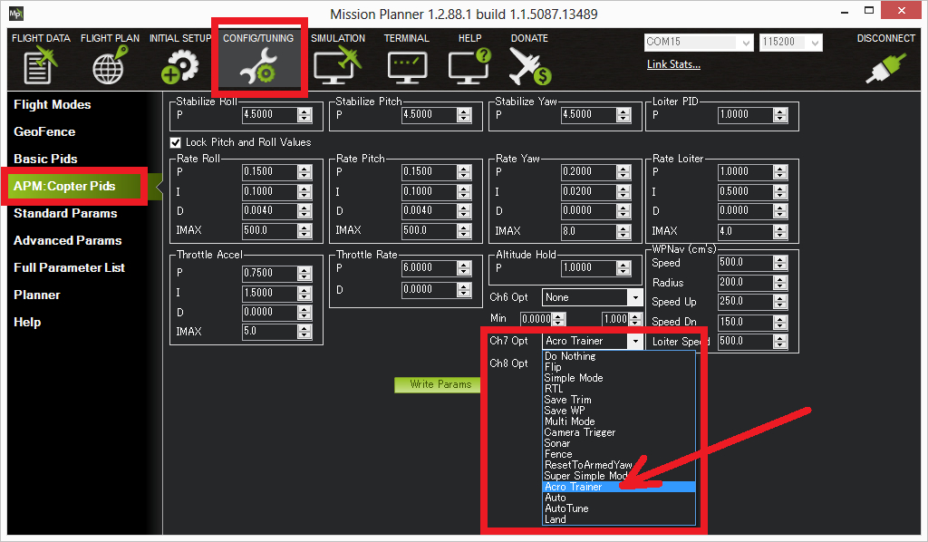 可以通过 Ch7/Ch8 开关或通道设置启用/禁用训练器。 RCx_OPTION 参数。使用 3 位开关时,关闭位置(即 PWM <1200)将禁用训练器,中间位置将启用选项 #1(自动调平),顶部位置(即 PWM >1800)将启用选项 #2(调平和倾角限制)。如果使用 2 位开关,则只能使用选项 #0(禁用)和选项 #2(调平 & 受限)。