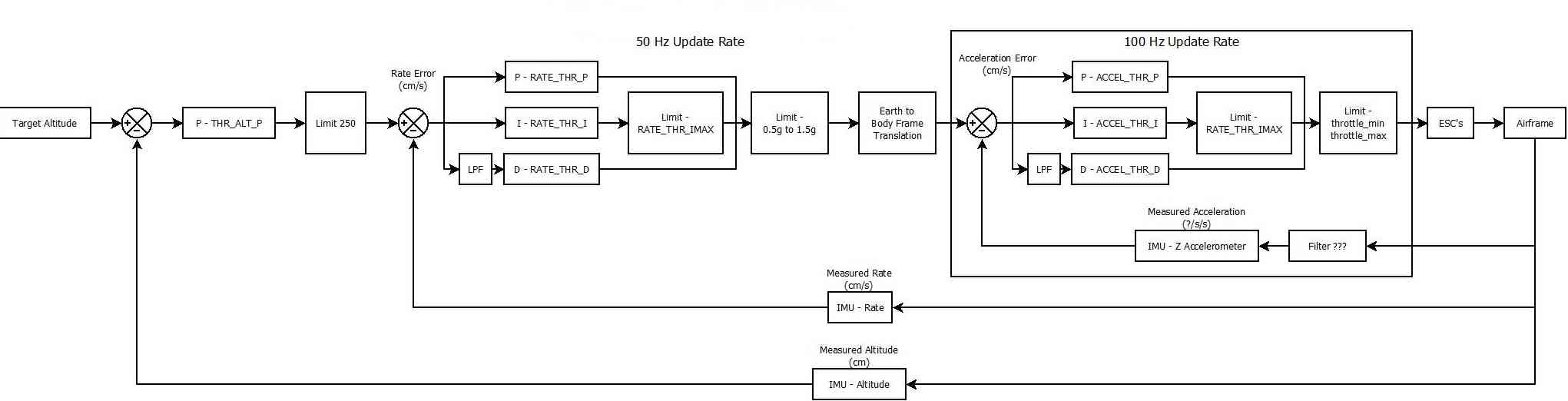 在油门中间死区之外(即低于 40% 或高于 60%),飞行器将根据操纵杆的偏转情况下降或爬升。当操纵杆完全向下时,飞行器将以每秒 2.5 米的速度下降,如果在最高点,则将以每秒 2.5 米的速度爬升。这些速度可以通过 PILOT_SPEED_UP 和 PILOT_SPEED_DN 参数。用于确定这些速度的加速度由以下参数设置 PILOT_ACCEL_Z.