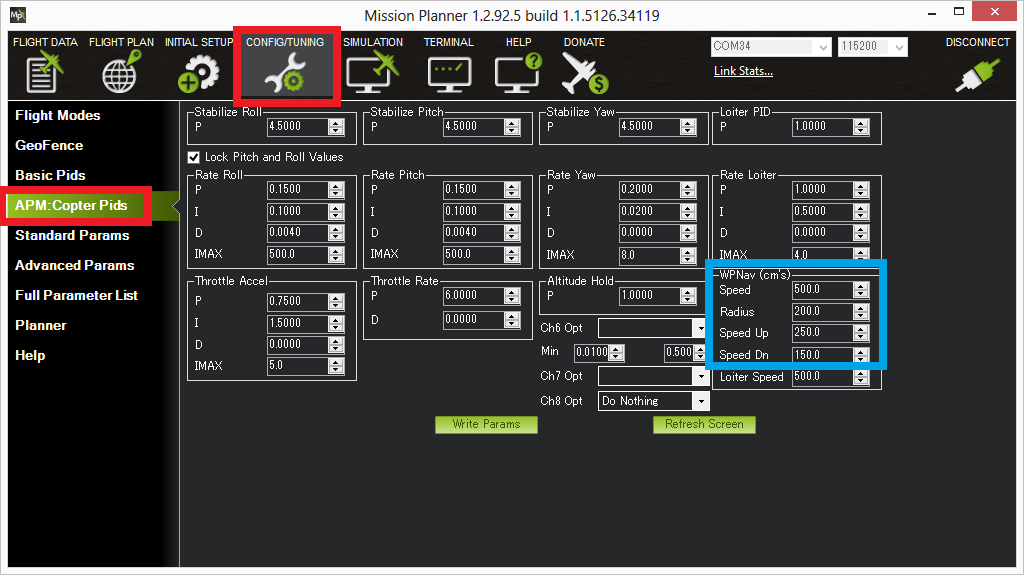 旋翼飞行器的最大水平速度可以用 速度 (WPNAV_SPEED)参数(见上方蓝框)。默认值为 500,表示 5m/s。在无法保持高度和水平速度之前,典型的旋翼飞行器最高速度可达 10m/s ~ 13m/s(即 1000 ~ 1300)。