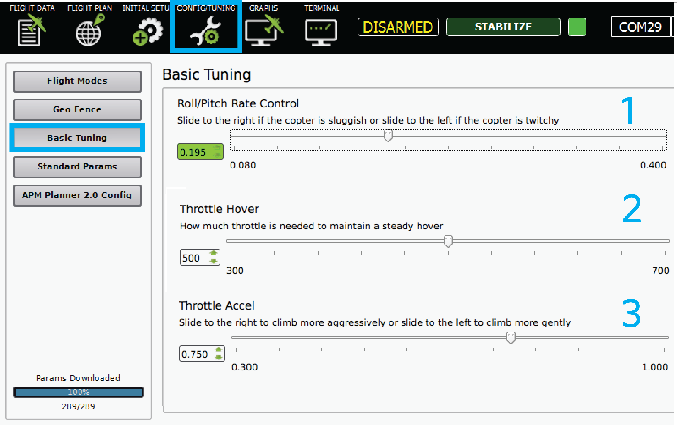将遥测无线电地面模块连接到地面站计算机,然后打开 Mission Planner 或 APM Planner。选择正确的 COM 端口并选择连接。您应该可以在 "飞行数据 "屏幕上看到实时数据。要开始飞行稳定调整,请选择配置/飞行稳定调整和基本飞行稳定调整。
