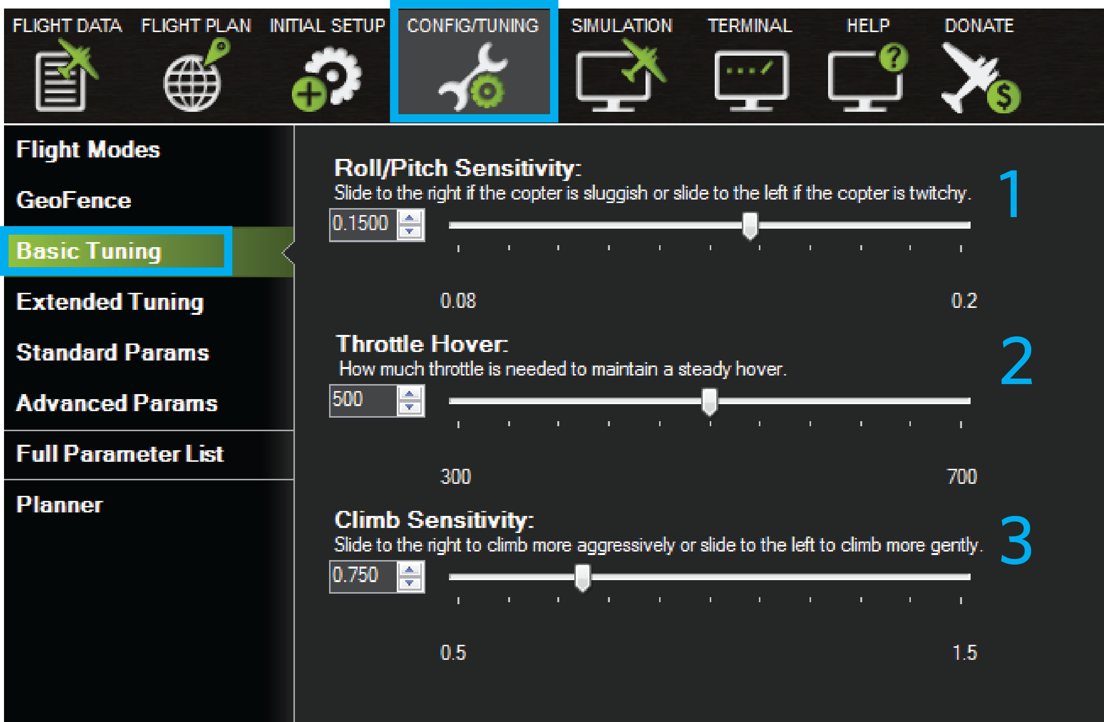 第一次飞行后,您可能会发现您的飞行器对控制输入的反应不尽如人意,或者您可能难以保持对飞行器的控制。如果您熟悉 PID 控制器,请查看 高级调整指南.如果您是一名经验丰富的操作员,请尝试 自动调整功能.本页将介绍Mission Planner地面站和 APM 计划器的基本调整部分,该部分将复杂的调整过程简化为几个简单的滑块。这是新操作员的最佳调整方法。