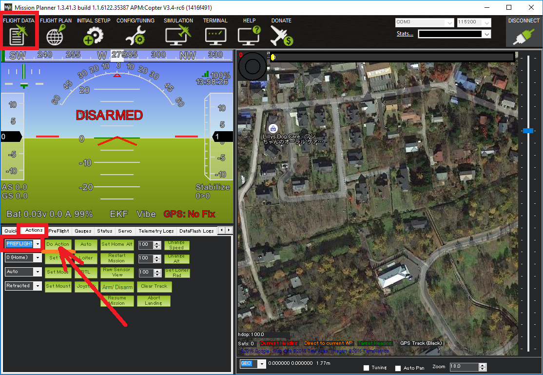 请注意,即使禁用了陀螺仪自动校准,也可以使用飞行数据屏幕的 "操作 "选项卡从Mission Planner地面站(或许还有其他地面站)手动触发陀螺仪校准。从左上角的下拉菜单中选择 "PREFLIGHT_CALIBRATION"(飞行前校准),然后按 "Do Action"(执行操作)按钮。