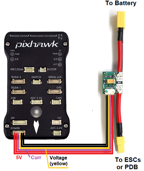 电源模块可为(飞行)控制器、接收机和一些低功率外设(激光雷达、遥测)提供足够的电力,但无法为舵机或 FPV 发射机或 RFD900 无线电设备等大电流设备提供足够的电力。更多信息 为 Pixhawk 供电,请参见此处