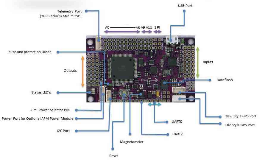 APM 2.6 没有板载指南针,专为载具优化设计,指南针应尽可能远离电源和电机源,以避免磁场干扰。