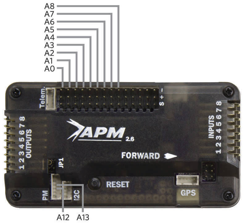 引脚 0 至 8:APM2 的一侧有一排模拟输入引脚,在电路板底部标为 A0 至 A8。在 PIN 变量中,这些引脚的编号为 0 至 8(含 8)。