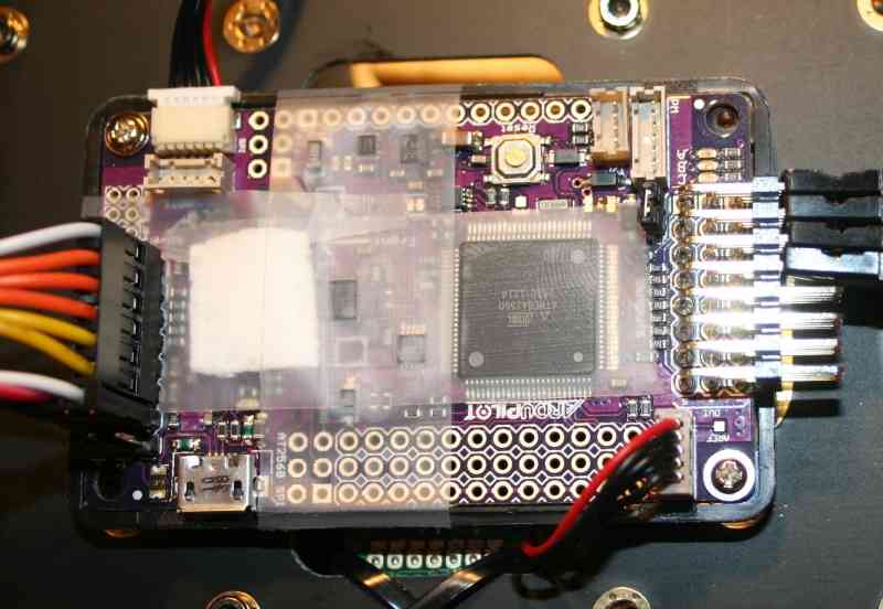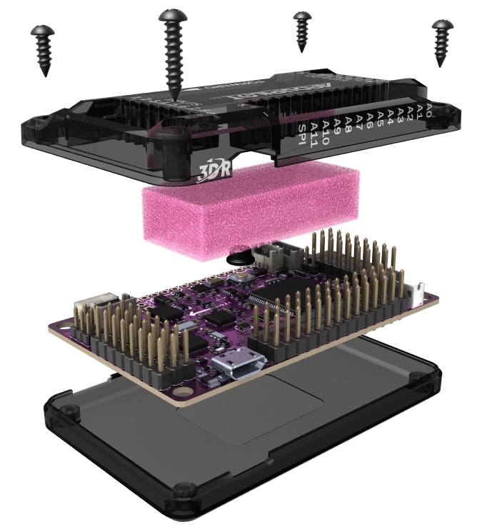 如图所示,APM 2.5/2.6 电路板装在一个外壳中,外壳上有泡沫保护气压传感器。