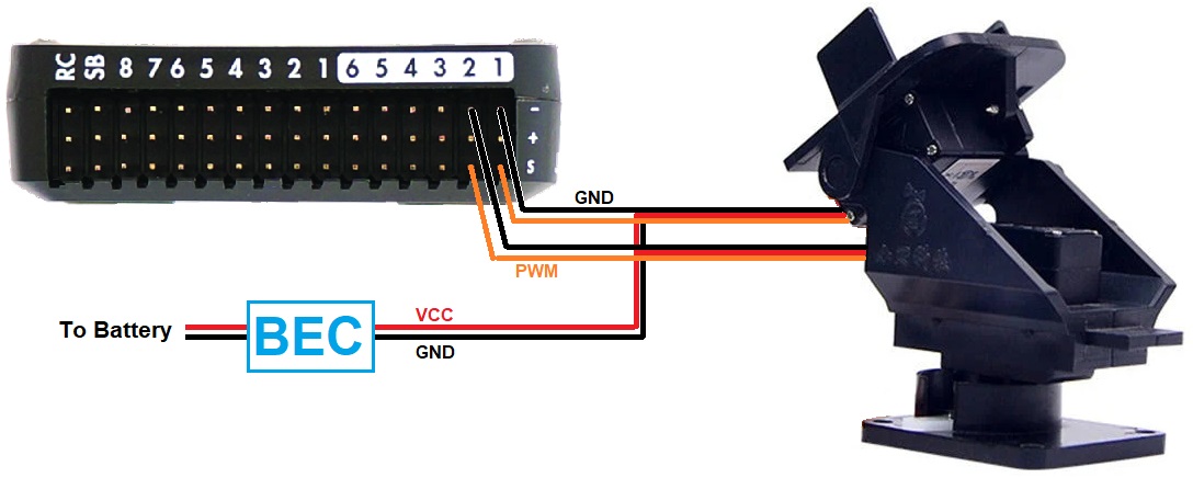 如下图所示,将万向节的滚动、俯仰和/或偏航舵机信号和接地引脚连接到(飞行)控制器的 PWM 输出引脚。大多数(飞行)控制器不在舵机轨上供电,这意味着需要单独的 BEC。