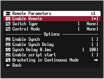 要让 CHDK 监听电缆,我们需要设置启用远程参数。在摄像机上访问 CHDK 菜单,选择 远程参数、 并选择 启用远程 如图所示。必须启用此设置才能与 CHDK 电缆通信。