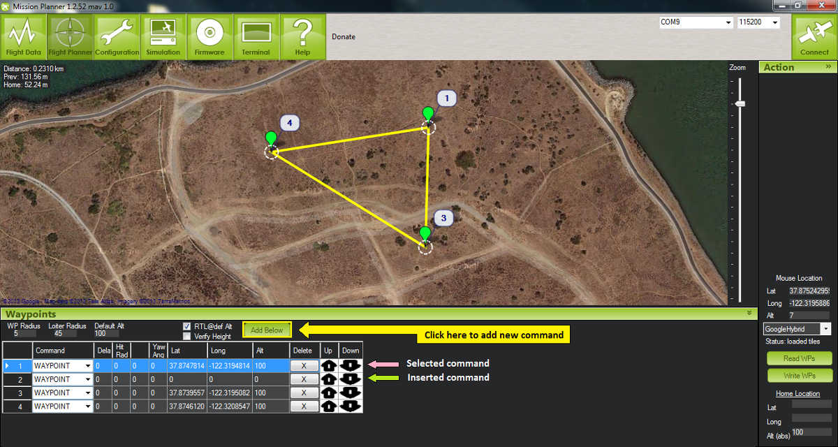 如下图所示在Mission Planner地面站中配置好航点后,选择第一个航点并点击 "添加以下内容"。
