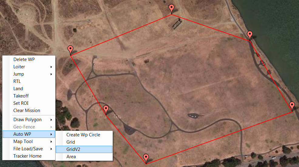 首先在Mission Planner地面站中找到要绘制地图的区域。右键单击并选择 绘制多边形.添加多边形点,直到在要绘制地图的区域周围创建一个多边形。对多边形满意后,右键单击并选择 自动 WP | GridV2 如下图所示。
