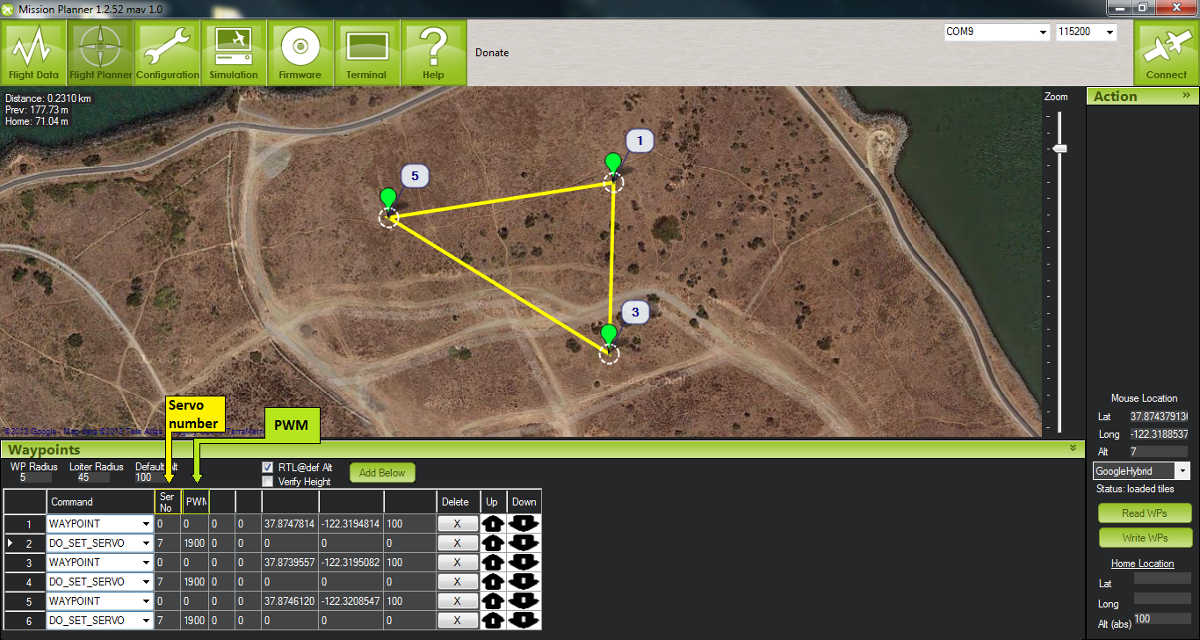 Mission Planner地面站允许您将伺服输出编程为航点事件。利用这一功能,我们可以添加一条命令,在飞机到达每个航点后输出 PWM 值(与开关位置和功能相对应)。