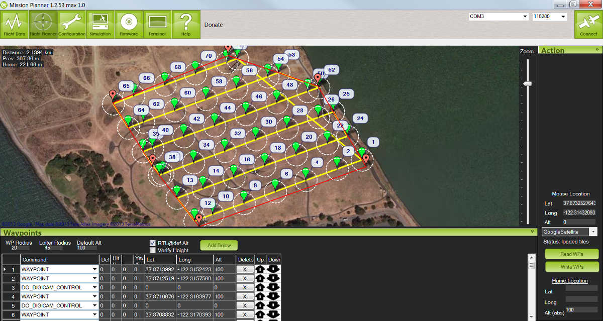 我们最喜欢的 CHDK 应用之一是通过将自动捕捉的图片拼接成合成图像来创建一个区域的地图。我们将使用相同的 3DR_Shoot.bas脚本。这个过程类似于在航点上设置快门触发器,只是为了确保拍摄到整个区域,我们需要更频繁、更有规律地设置航点。我们将使用Mission Planner地面站的 网格 V2 自动航点功能。