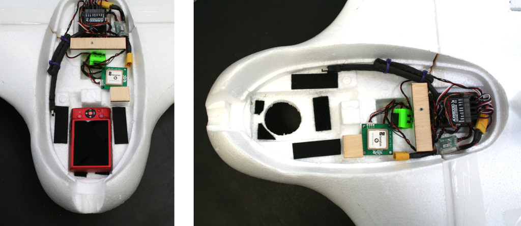 在准备起飞前,您需要将相机装入车内。为获得最佳效果,请将相机镜头朝下放置在飞机中央。您可能需要改装飞机机身,以便为相机留出空间。请务必在相机就位的情况下设置飞机的重心,并牢记相机在发生故障时的安全性。请查看我们的设置以获得灵感;我们使用了魔术贴条将相机固定到位。