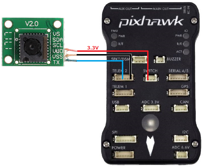 将传感器的 TX 和 VSS(又称 GND)引脚连接到(飞行)控制器的一个串行端口。上图中,传感器连接到 Pixhawk 的 Telem2 端口