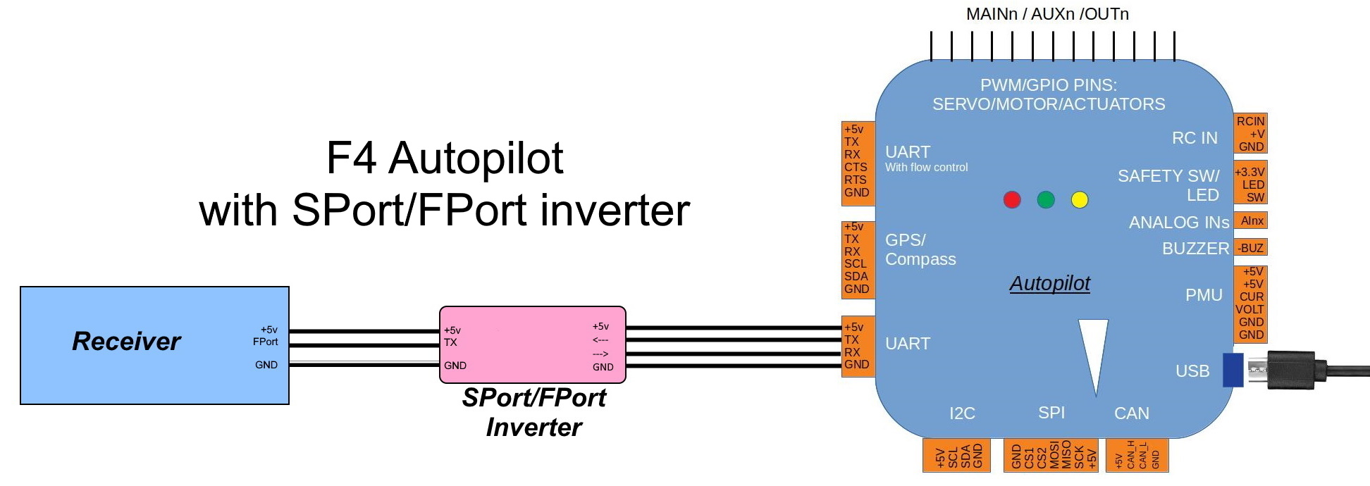 如果(飞行)控制器使用的是 F7 或 H7 处理器,则可以通过适当配置(飞行)控制器上的 UART 端口来实现。但是,大多数基于 F4 的(飞行)控制器不具备这种功能,需要从外部安装变频器。少数 F4 (飞行)控制器在电路板上安装了逆变器,并将端口标记为 "FrSky Telem",但大多数都没有。这些自动飞行器需要额外的 双向逆变器 (飞行)控制器与接收机的 SPort 或 FPort 之间连接。