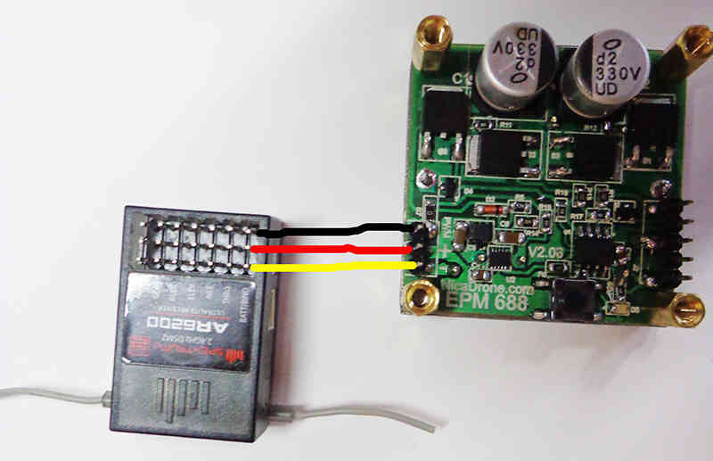 注意: 也可以(如果使用的是旧式的非 ppm-sum 接收器)将接收器的一根信号线直接连接到 EPM 的 PWM 引脚,从而完全绕过(飞行)控制器。下图显示了接收器和 EPM 之间的电源线连接,但这是不正确的,而且相当危险,因为电源尖峰可能会通过接收器到达(飞行)控制器。只应连接 PWM 和地线。EPM 应由 BEC 供电(如下图所示)。