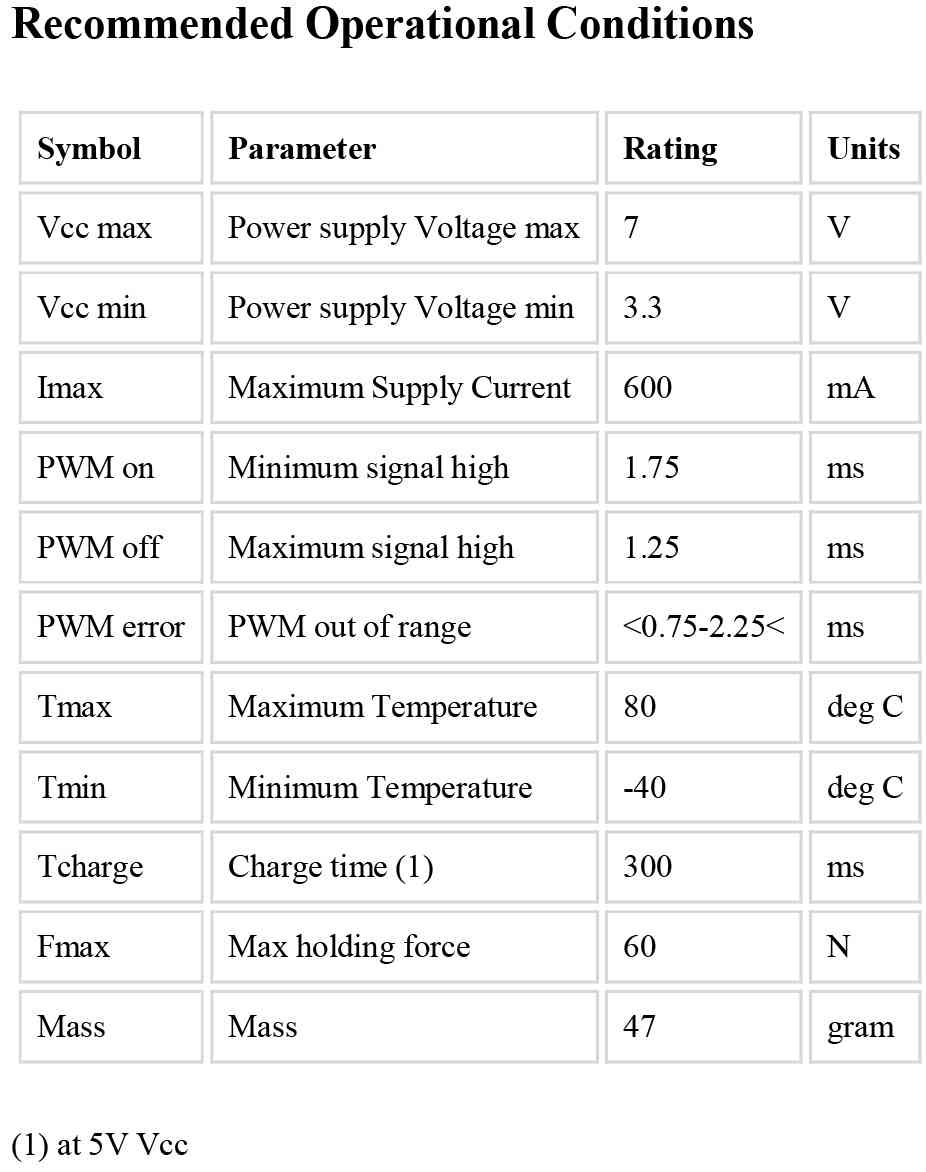 该装置接受标准 PWM 伺服输入,使用 5V 电源。仅在首次抓取或释放货物时的不到 1 秒钟内需要大量电源。