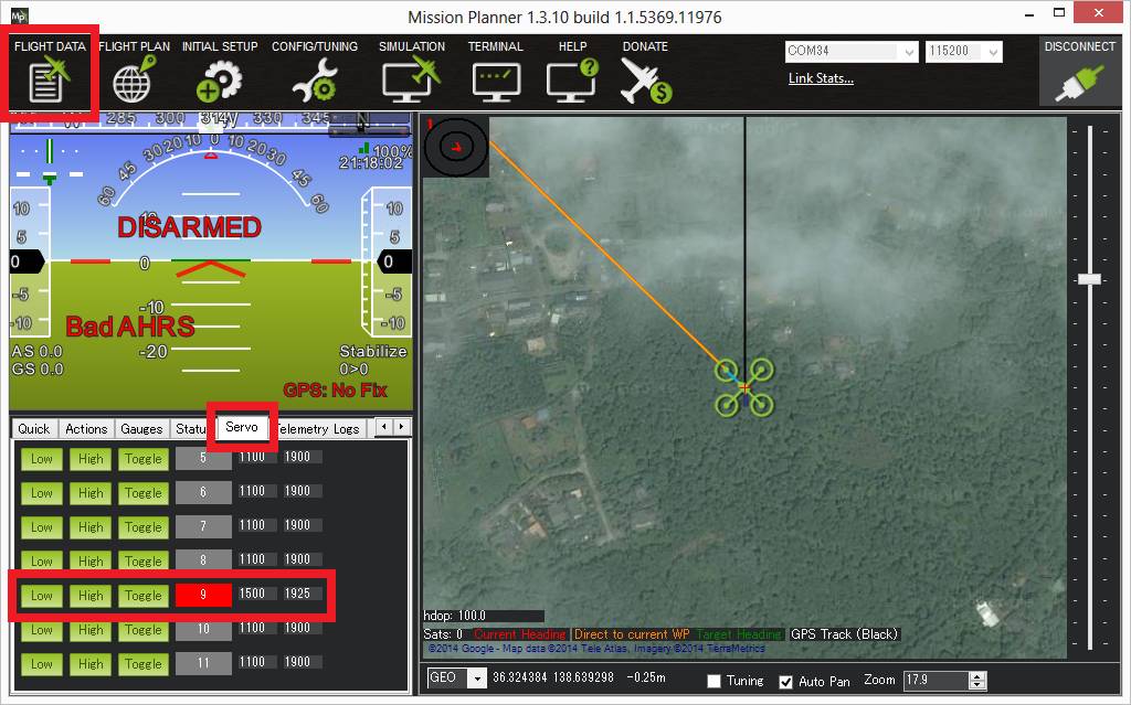 为了在任务开始前提取货物,请按下 EPM 上的黑色圆形按钮将其瞬间打开。一个麻烦的替代方法是使用Mission Planner地面站飞行数据屏幕的 "伺服 "选项卡,将输出瞬间设置为 1900 pwm(即下图中的 "高"),然后再返回中性(即下图中的 1500 或 "低")。