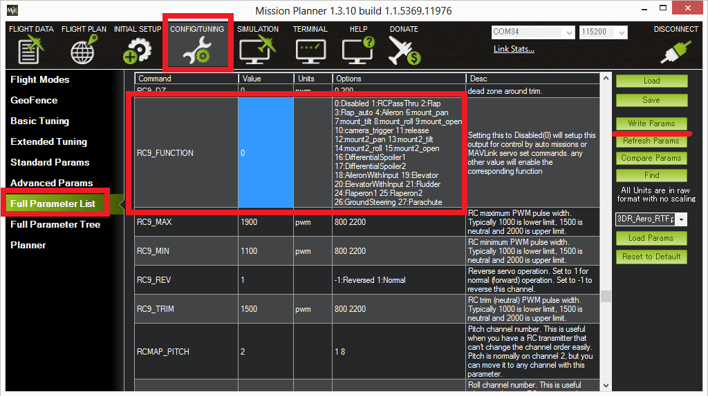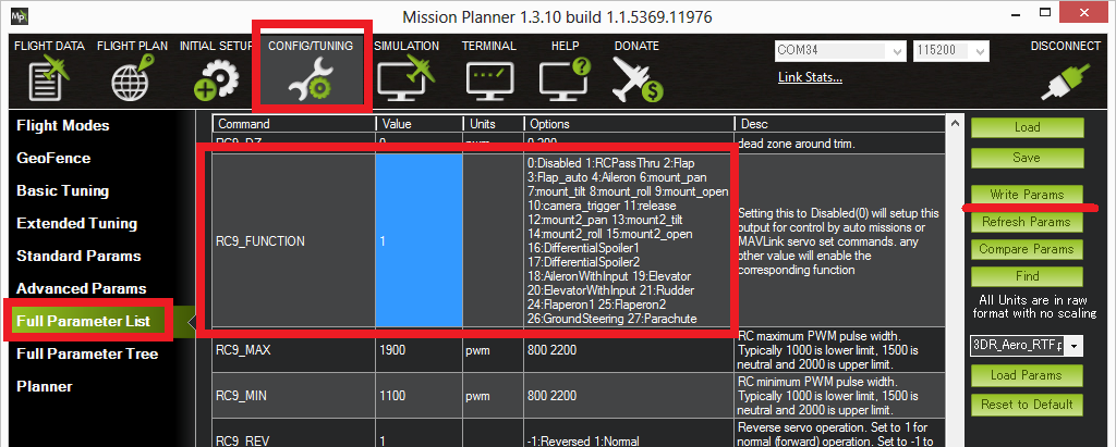 假设您的设置可以实现上述操作,请连接Mission Planner地面站。进入 "配置/调整 >>完整参数列表",设置 servo9_function (或 RC9_FUNCTION)设置为 "1"(即 "RCPassThru")。请注意,如果 EPM 连接到 AUX OUT 2,则 servo10_function 等。