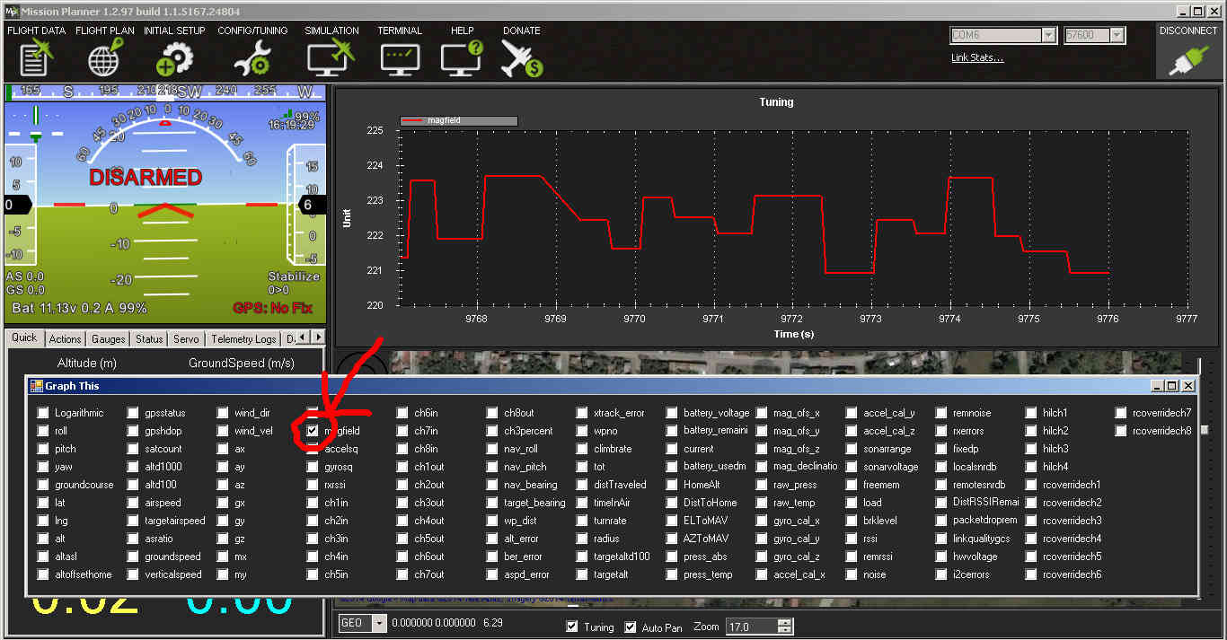 EPM 对罗盘的影响可通过连接Mission Planner地面站进行实时测试,进入 "飞行数据 "屏幕,点击底部中间的 "调整 "复选框。双击右上方出现的图表,在出现 "Graph This(此图表)"窗口时选择 "magfield(磁场)"。