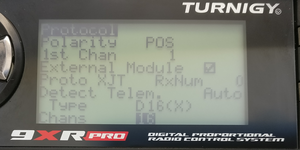 模型 设置菜单,然后选择规程.确保原型设为XJT和类型设为D16.在旧版本的固件中,您可能会看到 PXX 而不是 XJT.