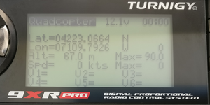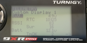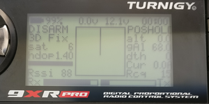 此时,您的 9XR Pro 应该可以接收到扩展遥测数据。如果您导航到遥测主屏幕(使用向上/向下箭头在屏幕之间切换),您应该可以看到标准的 FrSky 遥测值(如 RSSI、接收机电压等)以及扩展遥测值,如飞行模式、当前测量值、GPS 信息等。