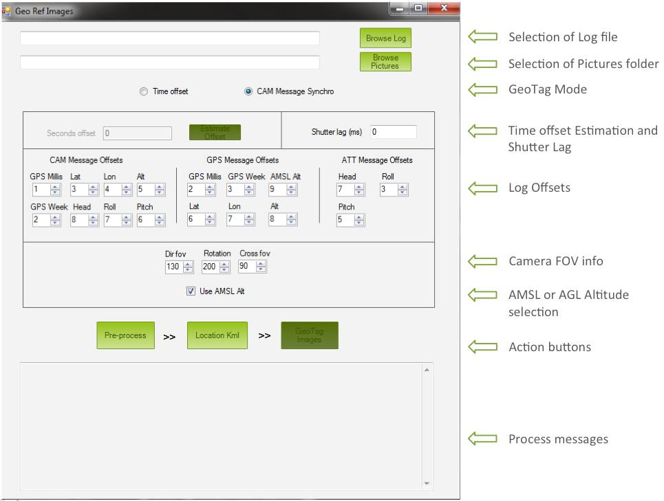 做数码摄像机控制或do_set_cam_trigg_dist命令。相应的 CAM 信息存储在数据闪存日志中,Mission Planner地面站可利用这些信息为图像添加准确的地理标记信息。时间偏移(图像时间戳到日志时间戳)