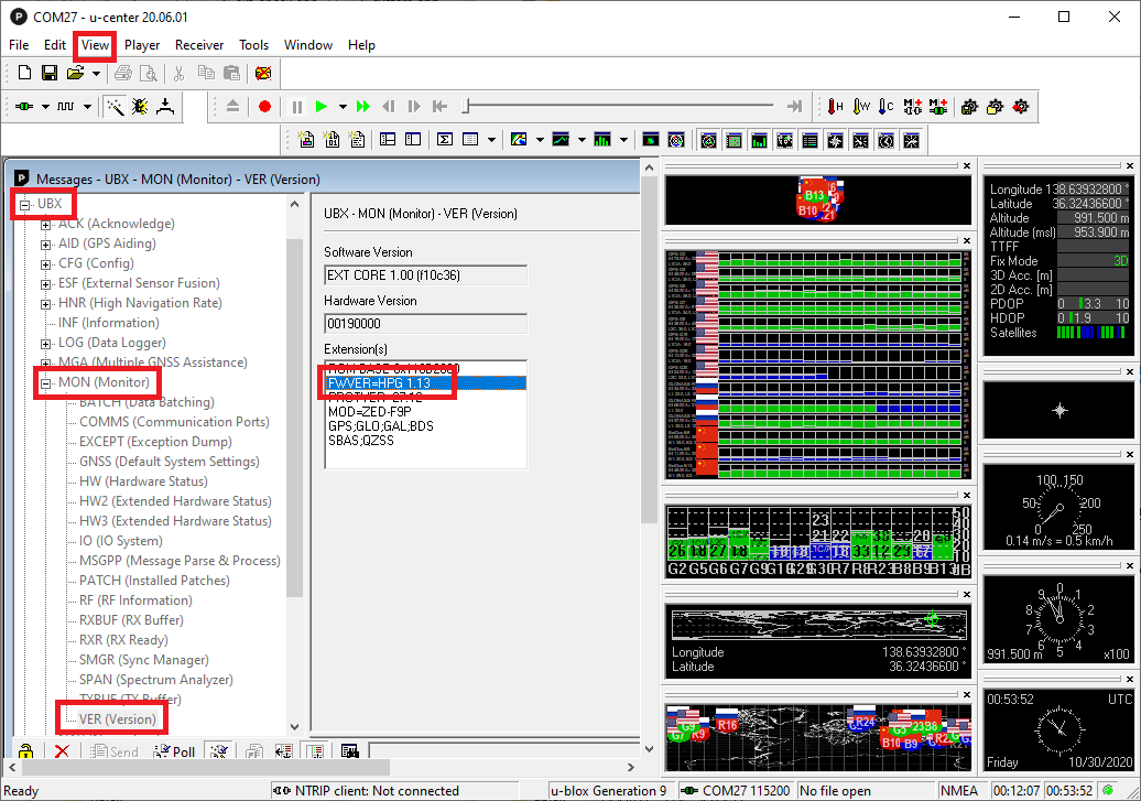 选择 "查看"、"信息查看"、"UBX"、"MON"、"VER",检查 GPS 当前的固件版本。