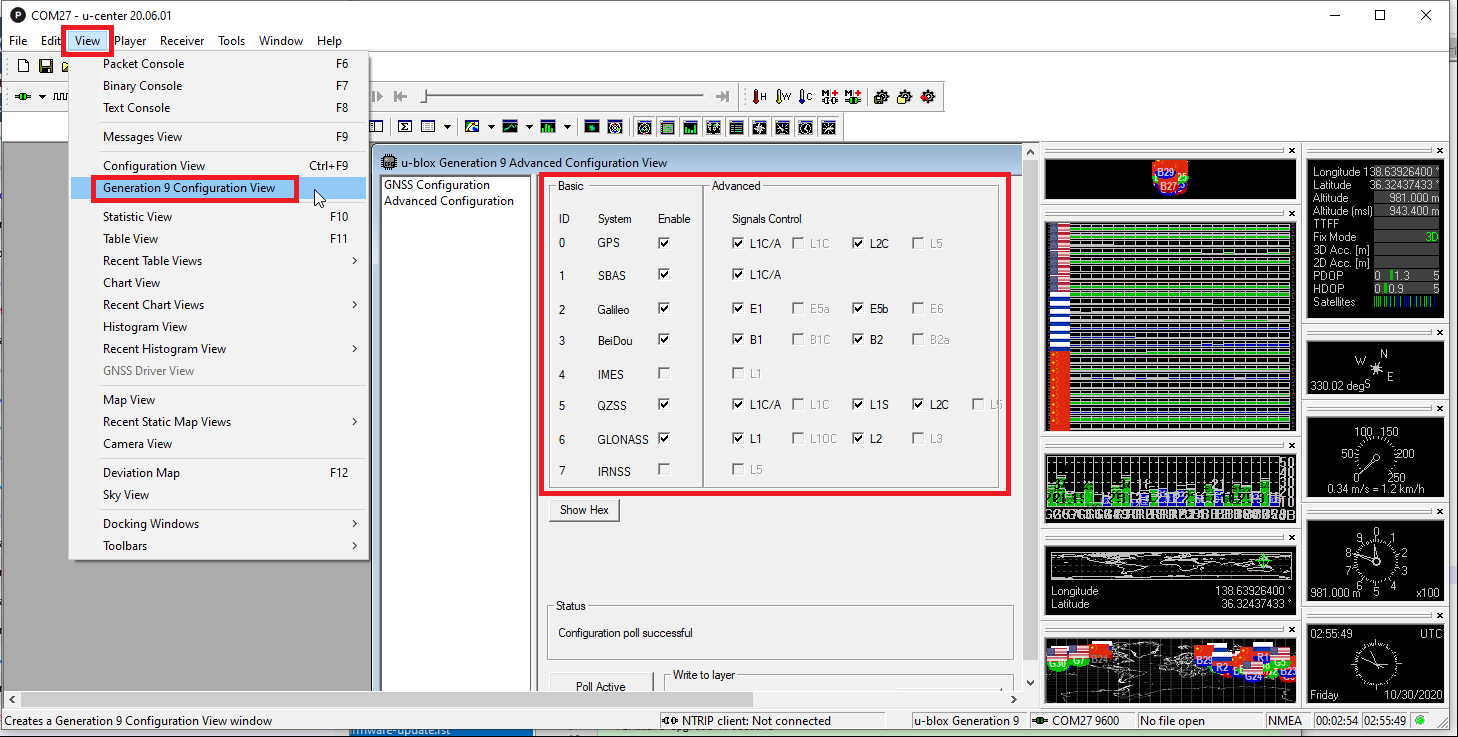 ArduPilot 不会自动配置 F9 启用的星座,因此应使用 u-center 手动设置,如下所示
