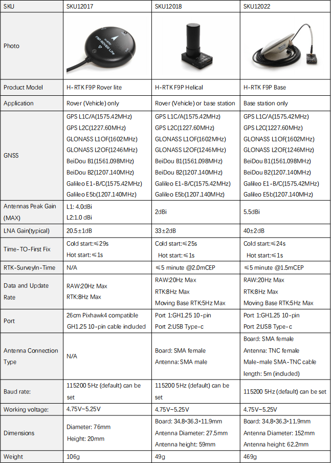 Holybro H-RTK F9P 有三种型号可供选择,每种型号都有不同的天线设计,以满足不同的需求: