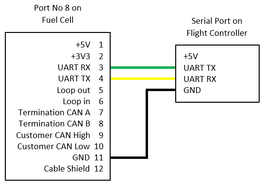 将 UART 从燃料电池上的 8 号端口连接到(飞行)控制器上的任意串行端口。 参见设备用户手册 了解有关 8 号端口的详细信息。只需连接 GND、UART TX 和 UART RX。请参见下图: