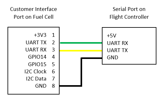 将 UART 从燃料电池上的 "客户接口 "端口连接到(飞行)控制器上的任何串行端口。 参见设备用户手册 了解有关 "客户接口 "的详细信息。只需连接 GND、UART TX 和 UART RX。请参见下图: