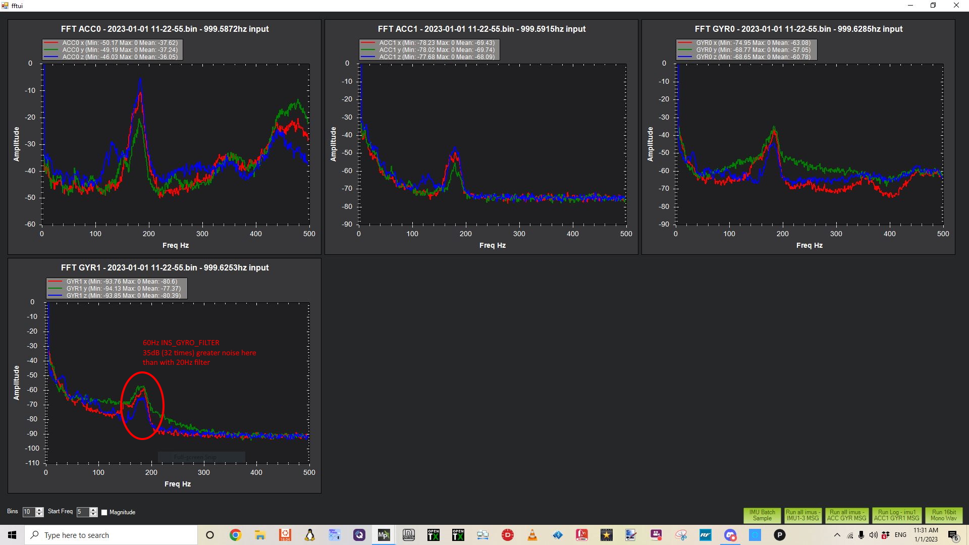 显示了四幅图:ACC0- 过滤前的加速度计频谱、ACC1- 过滤后的加速度计频谱、GYR0 - 过滤前的陀螺仪频谱和 GYR1- 过滤后的陀螺仪频谱。频率超过 100Hz 的振动可能会导致姿态或位置控制问题。