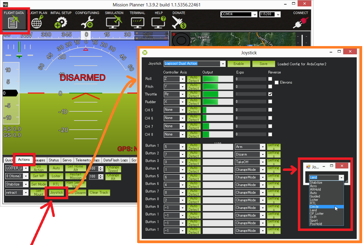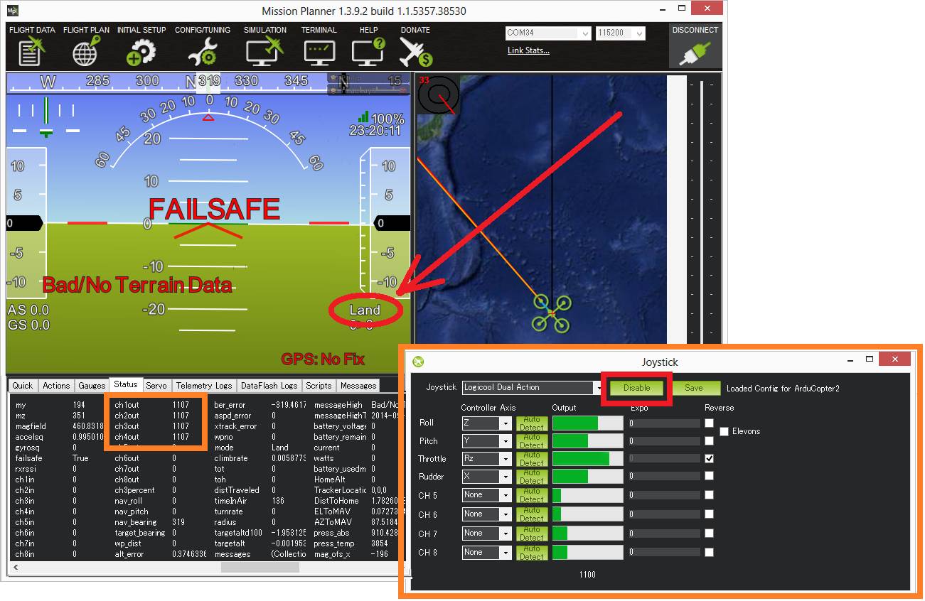 如果失去无线电联系,载具的反应应该是操纵杆已 "禁用 "或与电脑断开连接。您可以重复上述测试,但不要按下 禁用 按钮,断开无线电连接。为了查看飞行器的状态,您需要分别连接两个Mission Planner地面站(仅在 Pixhawk 上可行)。带操纵杆的Mission Planner地面站应通过遥测连接,第二个Mission Planner地面站应通过 USB 连接。
