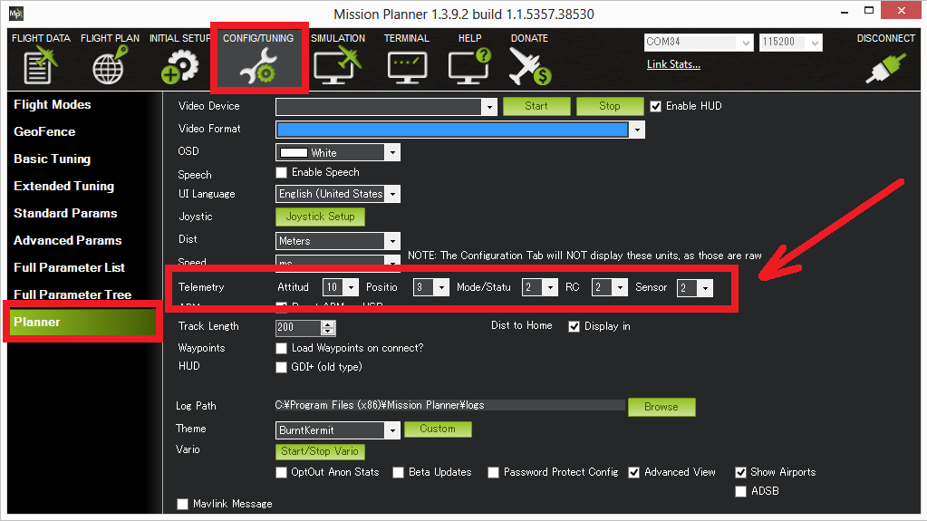降低载具与 GCS 之间从 MP 发送其他遥测数据的速度 配置/调整 | 规划器 页码