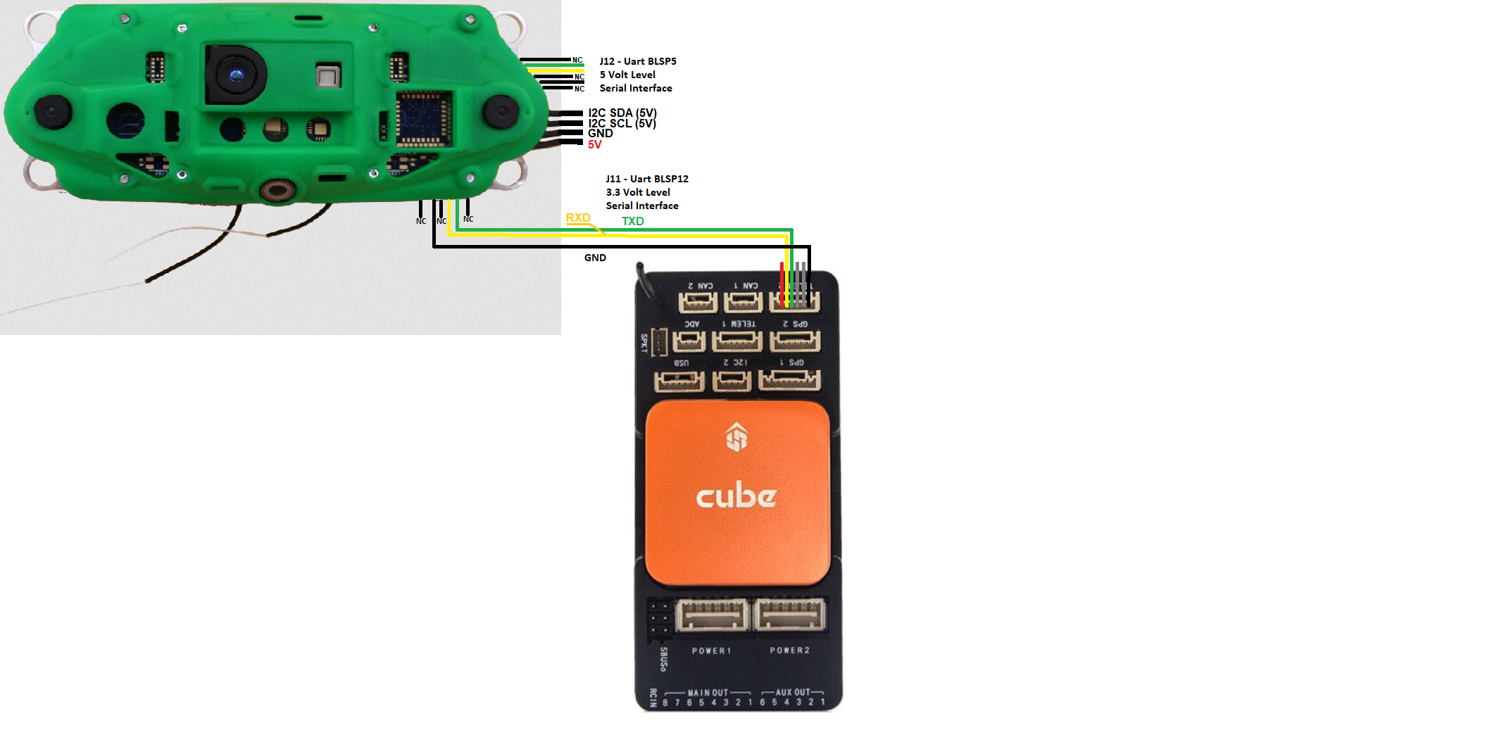 如上图所示,将 VOXL 摄像机连接到(飞行)控制器。在这些说明中使用的是(飞行)控制器的 Telem2 端口。
