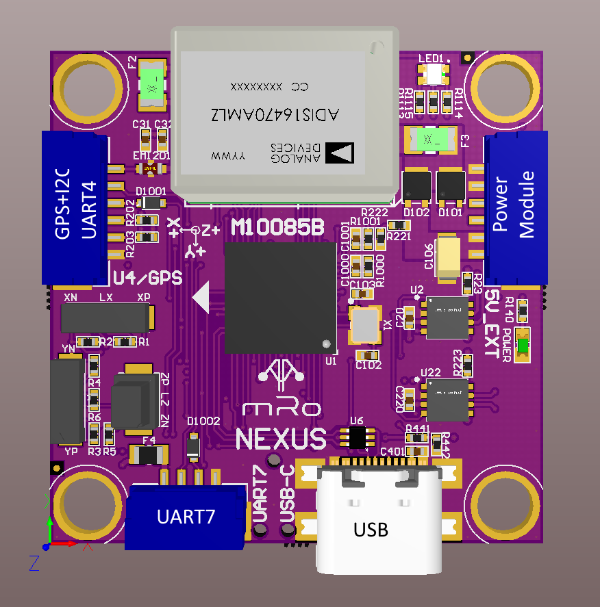 "这款" mRo Nexus 是 mRobotics 下一代 Pixracer (飞行)控制器系列中的一员。它专为超小型应用而设计,主要使用 CAN 外围设备以及标准 GPS/罗盘或空速传感器。它包括一个集成的 ADS-B 接收机,用于规避。