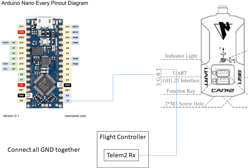 可以将标签的 UART 端口直接连接到 FC。不过,某些 FC 的 UART Tx 与 Nooploop 的 UART Rx 不兼容(据 Nooploop 开发人员称,这似乎是 Nooploop 节点内的 CP2012 造成的。删除 CP2012 有可能解决这个问题)。它会导致 FC 无法与标签通信。Pixhawk 4 mini 和 Kakute F7 已确认存在此问题。在这种情况下,可以使用 Arduino Nano Every 作为一种变通办法。使用 Ardnio IDE 上传 Nooploop 变通草图 并将其 UART Tx 连接到标签的 UART Rx。在下文中,我们假设标签连接到 FC 的 UART 端口(对应 SERIAL1)。