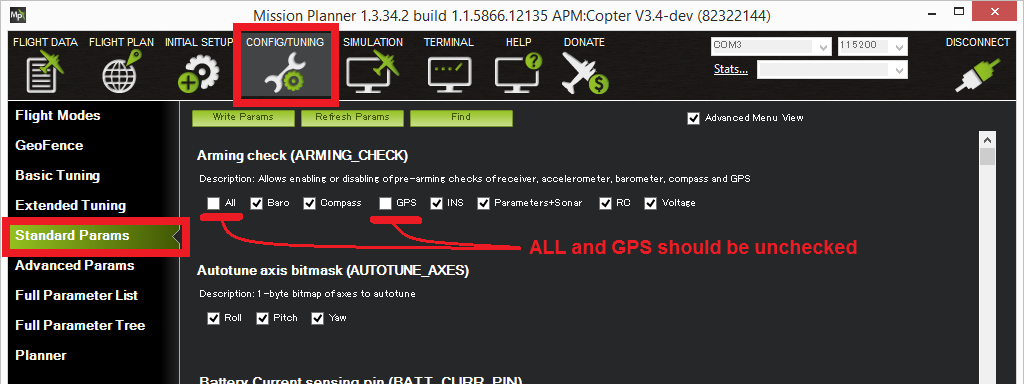 要允许在没有 GPS 的情况下在 Loiter 启动和起飞,应关闭 GPS 启动检查,如下图所示。取消选中 "全部 "和 "GPS",并选中所有其他选项。