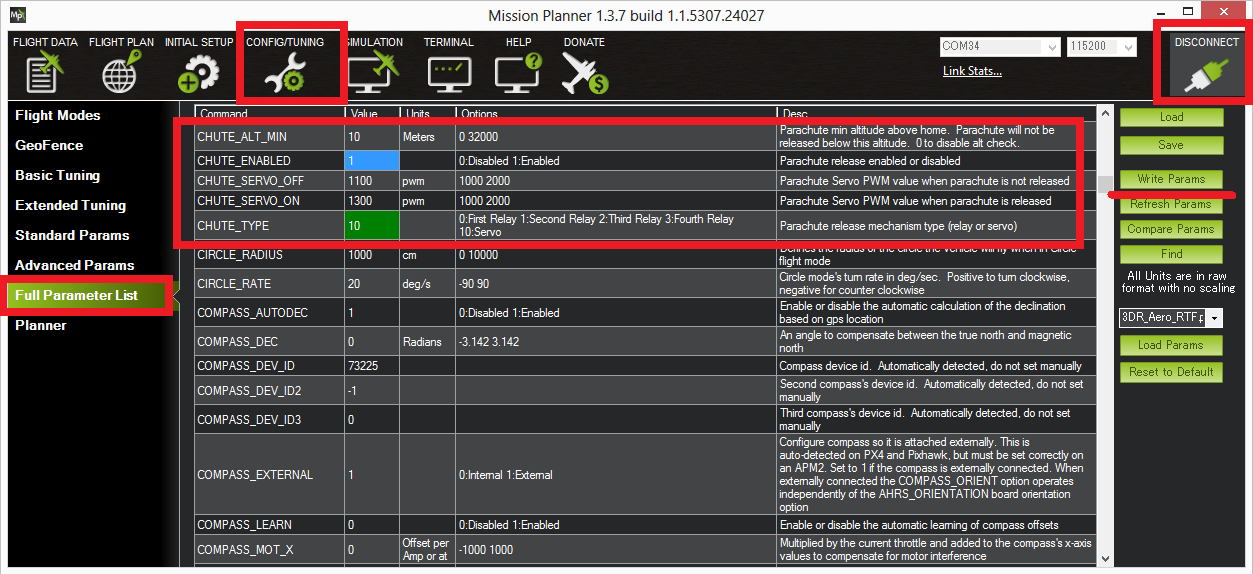 要配置降落伞释放,首先使用Mission Planner地面站连接(飞行)控制器,然后打开 CONFIG->全参数列表选项卡并设置以下参数。