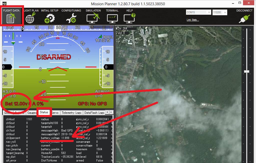 检查通过 Mission Planner地面站's 初始设置 | 可选硬件 | 电池监视器 屏幕或飞行数据屏幕的 HUD 或 现状 标签。
