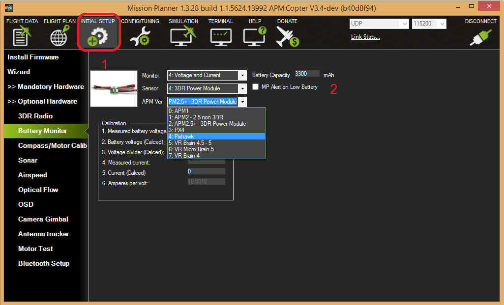 关于 Mission Planner地面站's 初始设置 | 可选硬件 | 电池监视器 屏幕将 "传感器 "设为 "其他"。