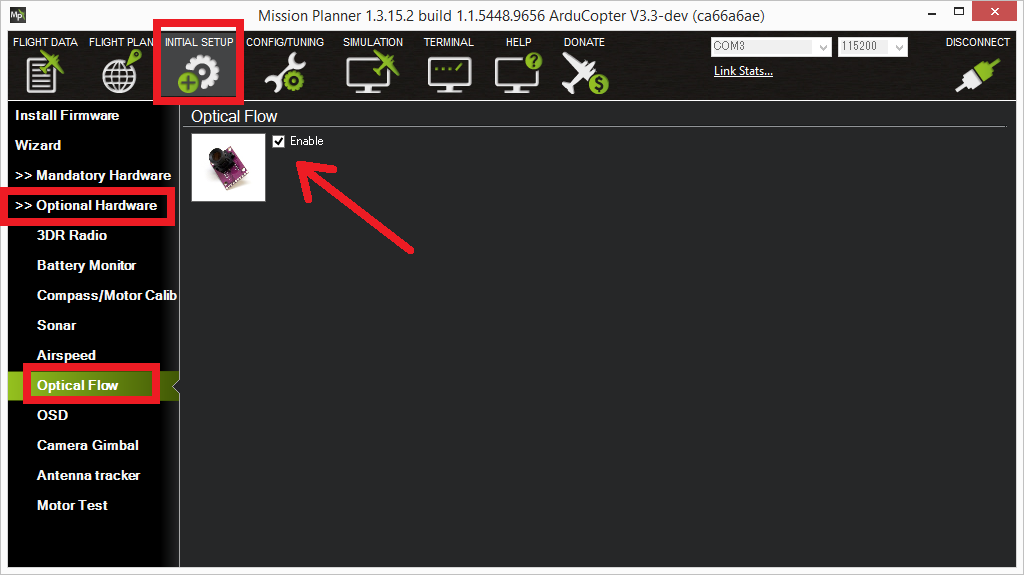 使用任务规划程序连接(飞行)控制器,然后在 初始设置 | 可选硬件 | 光流 页检查 启用 复选框。或者 流量类型 参数应通过完整参数列表设置为 "1"。Pixhawk 电路板重启后,传感器将被初始化。