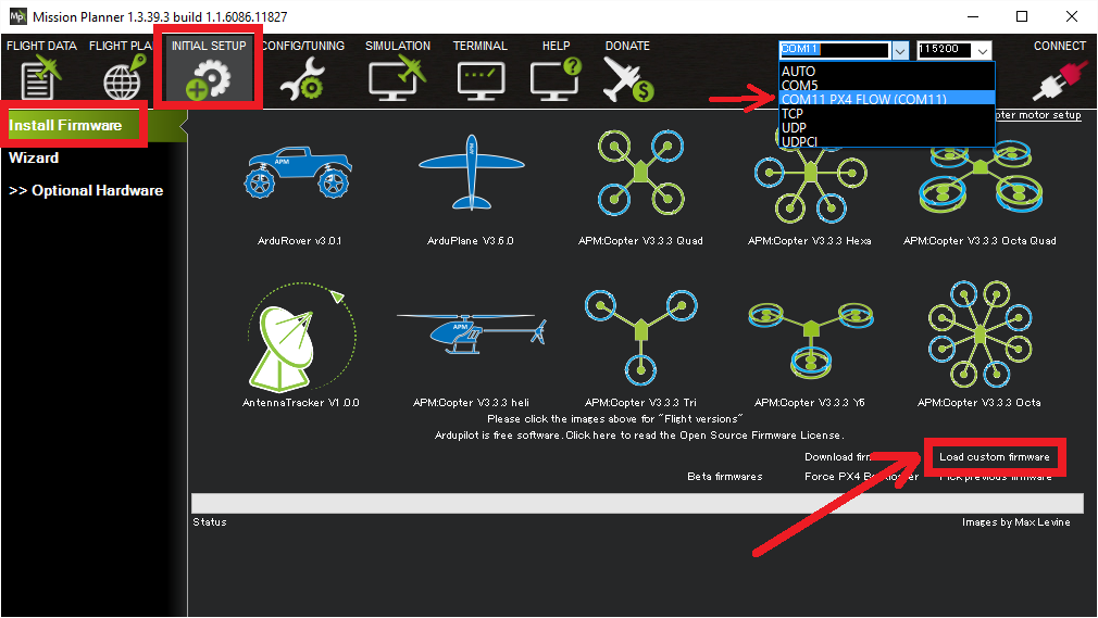打开 "初始设置"、"安装固件 "屏幕,选择 COM 端口并单击 "加载自定义固件 "链接。选择在步骤 1 中下载的 px4flow-klt-06dec2014.px4 二进制文件。您可能需要拔下传感器插头并插回才能开始上传。