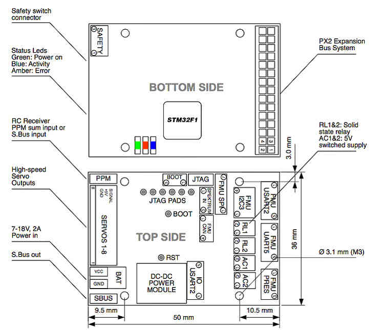 • PX4-IO 板包含自己的板载微控制器,并与 PX4-FMU 板堆叠。